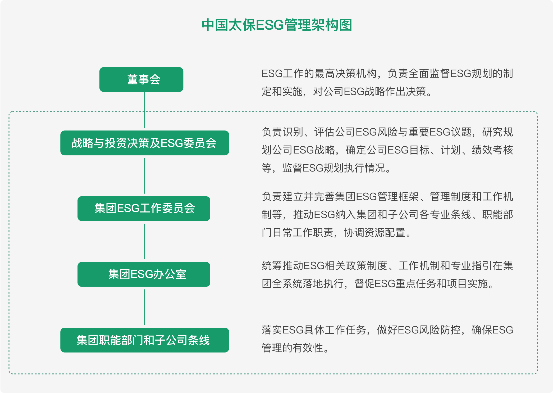 中國(guó)太保設(shè)立ESG相關(guān)考核指標(biāo),覆蓋集團(tuán)和主要子公司,保障ESG治理有效落實(shí)。