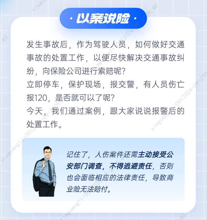 事故發(fā)生后,作為駕駛?cè)藛T應(yīng)及時(shí)報(bào)警,配合搶救傷者,積極主動(dòng)配合交警進(jìn)行調(diào)查和處理,到交警隊(duì)提供相關(guān)證據(jù)和信息,不得逃避調(diào)查,若逃避、不配合公安部門調(diào)查也將構(gòu)成肇事逃逸,若駕駛?cè)擞薪煌ㄕ厥绿右莸那樾危瑢儆谏虡I(yè)險(xiǎn)責(zé)任免除范圍內(nèi)。