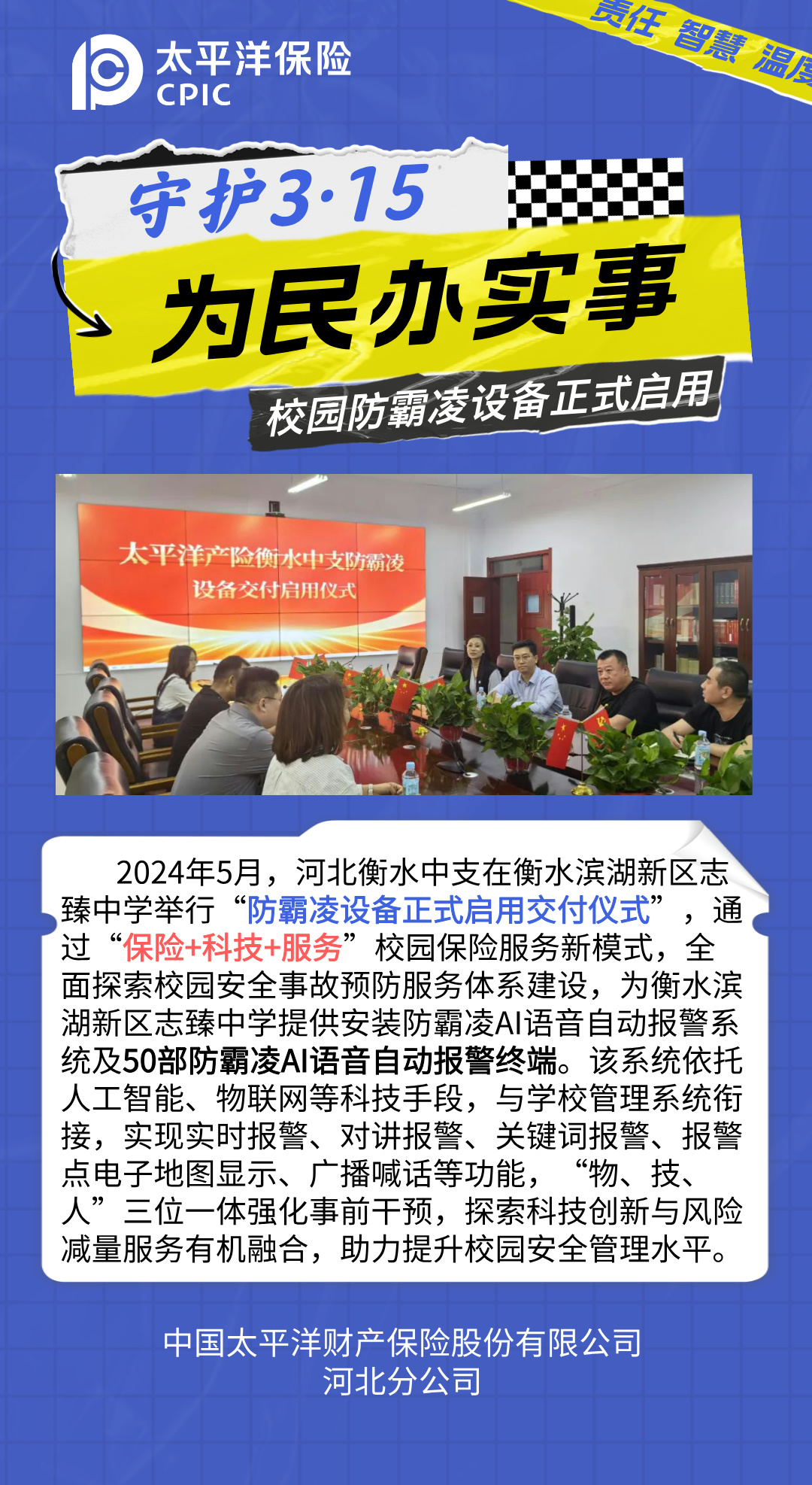中國(guó)太保產(chǎn)險(xiǎn)河北分公司為民辦實(shí)事之校園防霸陵設(shè)備正式啟用
