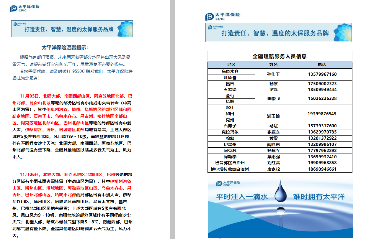 未來兩天新疆部分地區(qū)將出現(xiàn)大風(fēng)及暴雪預(yù)警,請注意防范。如需幫助,請致電95500全國客服電話或直接撥打全疆理賠服務(wù)電話 ? 太平洋保險(xiǎn)在您身邊!