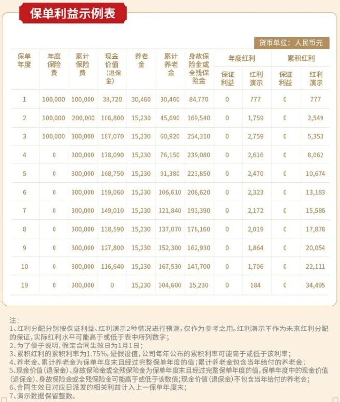 注:1.保險期間屆滿時不再給付養(yǎng)老金。2.在任何情況下,身故保險金和全殘保險金不可兼得,即若本公司給付任何一項保險金,另一項保險金不再給付。