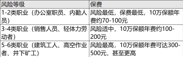 保險公司將職業(yè)劃分為1-6類,風險等級越高,保費越高。例如:
