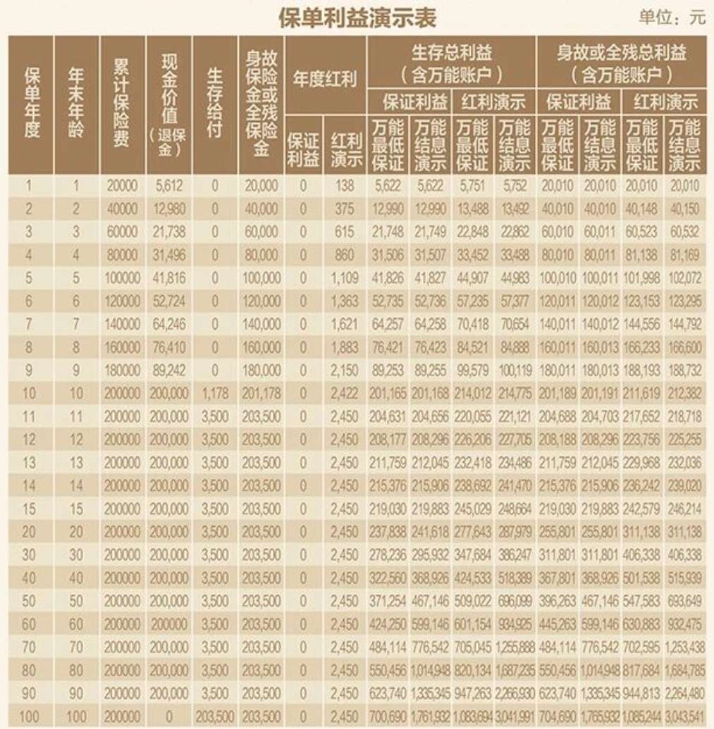 | 保單年度 | 累計(jì)保費(fèi) | 現(xiàn)金價(jià)值 (退保金) | 年度紅利 | 生存總利益(含萬能賬戶) | 身故或全殘總利益(含萬能賬戶) | |||||||